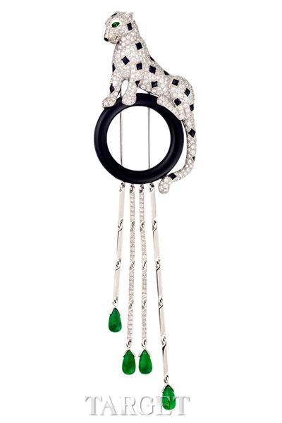 猎豹是卡地亚的品牌象征之一,1914年,它首次现身于珠宝世界,而路易・卡地亚则是赋予这一品牌象征灵感的先驱,此后,路易的合作伙伴贞・杜桑 (Jeanne Toussaint)将猎豹创意发挥得淋漓尽致:手镯、胸针、耳环、长项链、腕表,都有猎豹矫健的身形。新系列更是以丰富多彩的猎豹形态,尽情展现野性之美,动物之魅。Panthère de Cartier胸针,白18K金,镶嵌453颗总重3.25克拉的圆形明亮式切割钻石,缟玛瑙,祖母绿。